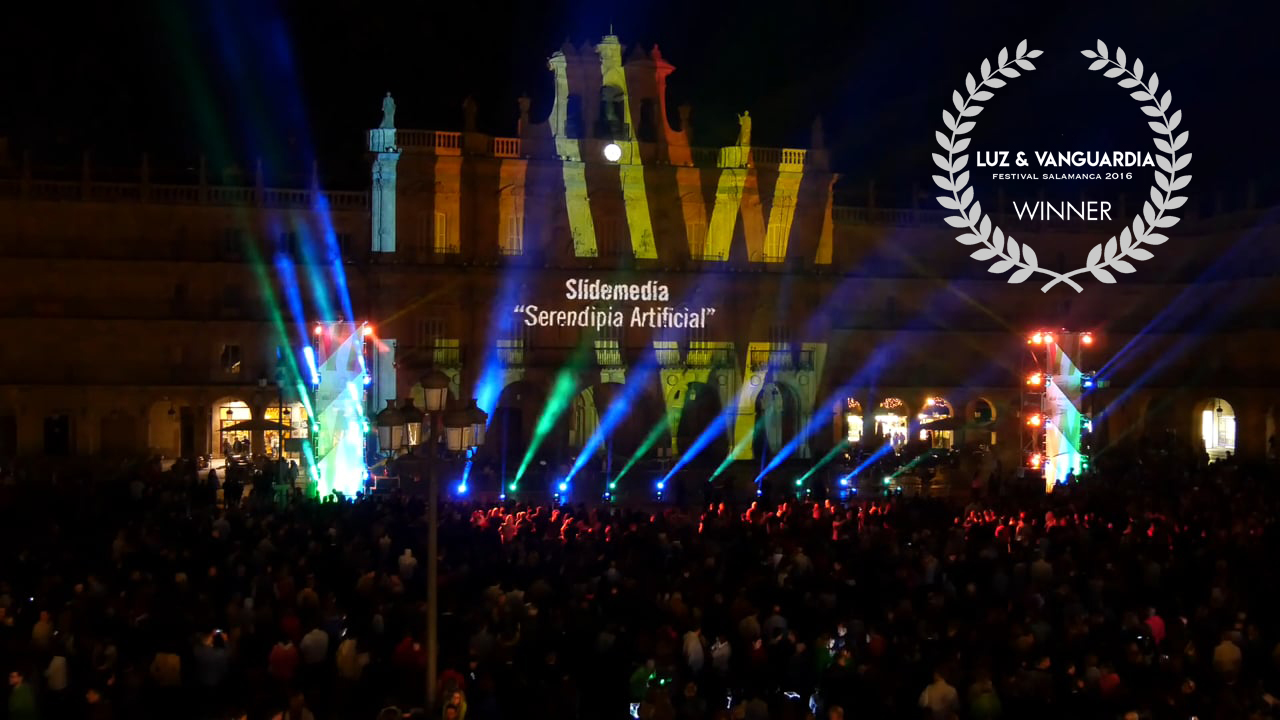 Slidemedia ganó el premio del jurado en la primera edición con la obra «Serendipia Artificial», un proyecto de luces y sombras que destacó por el ritmo frenético de la pieza sobre los elementos arquitectónicos de la fachada del Ayuntamiento de Salamanca.