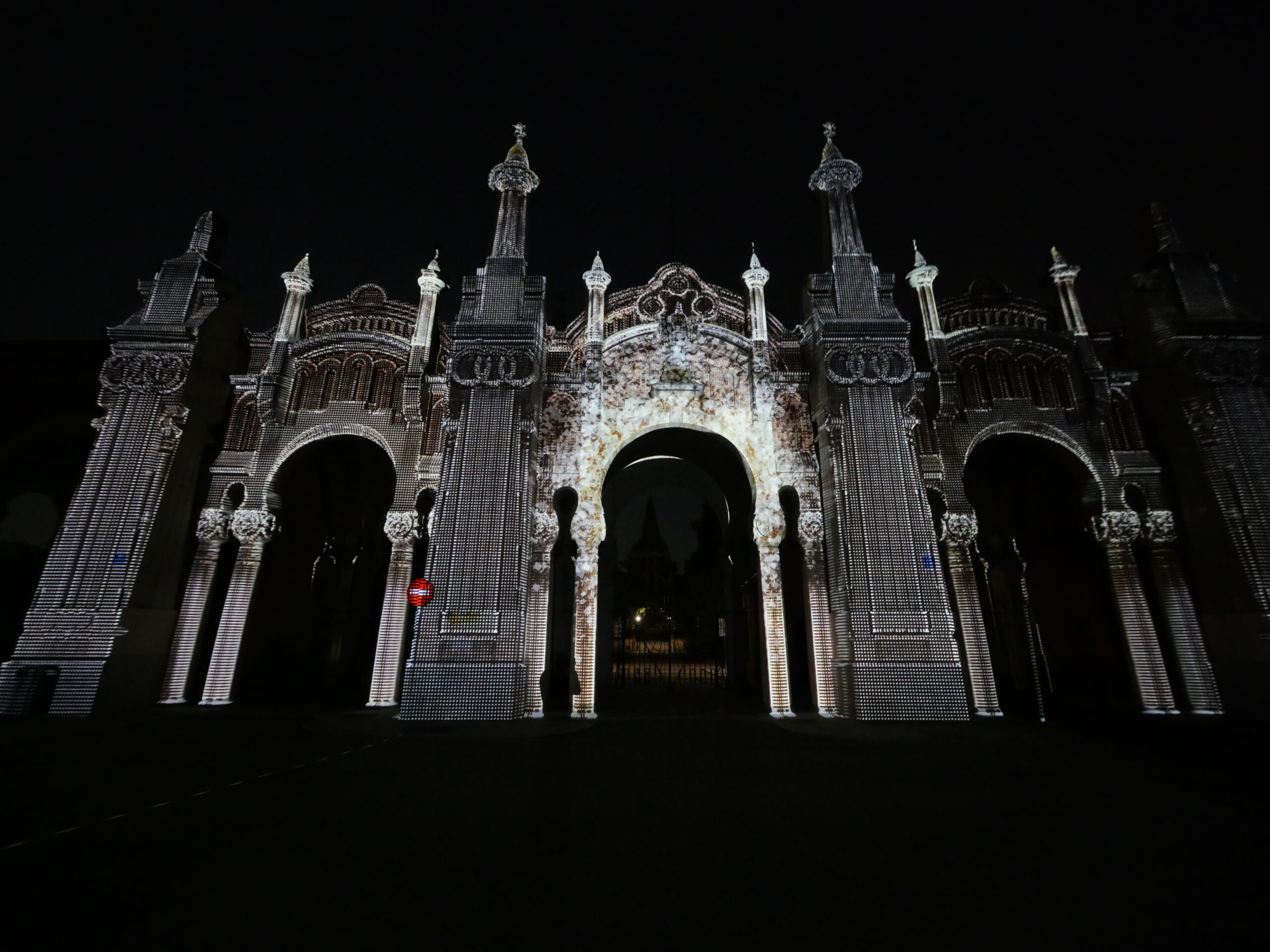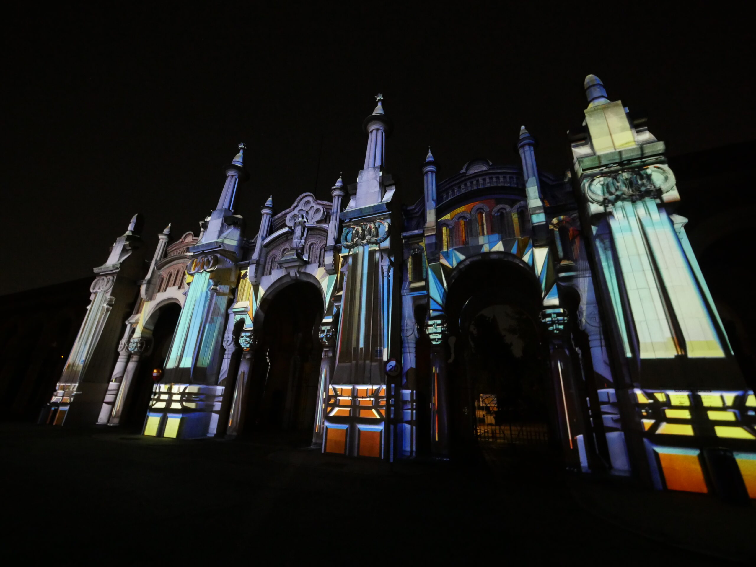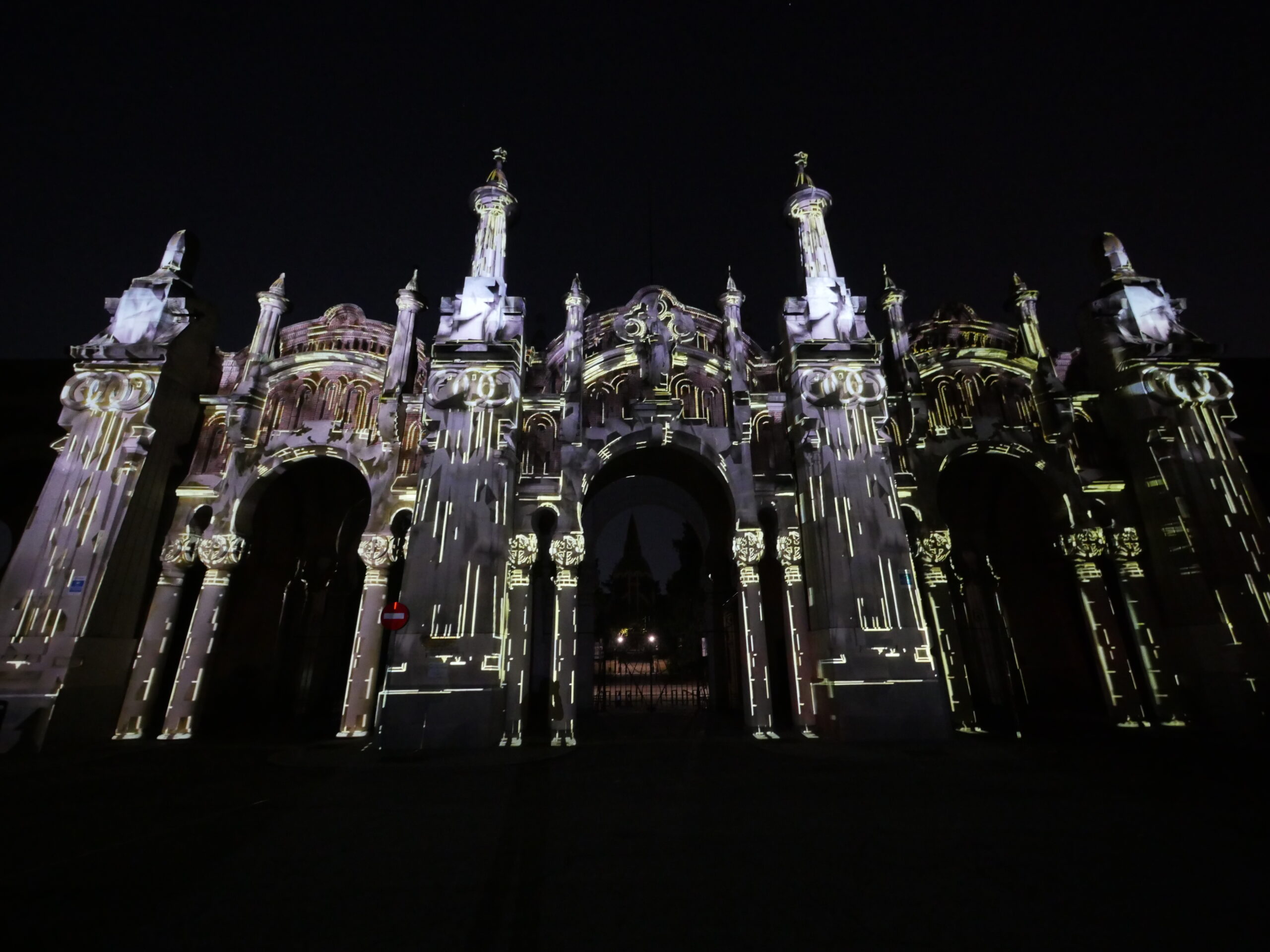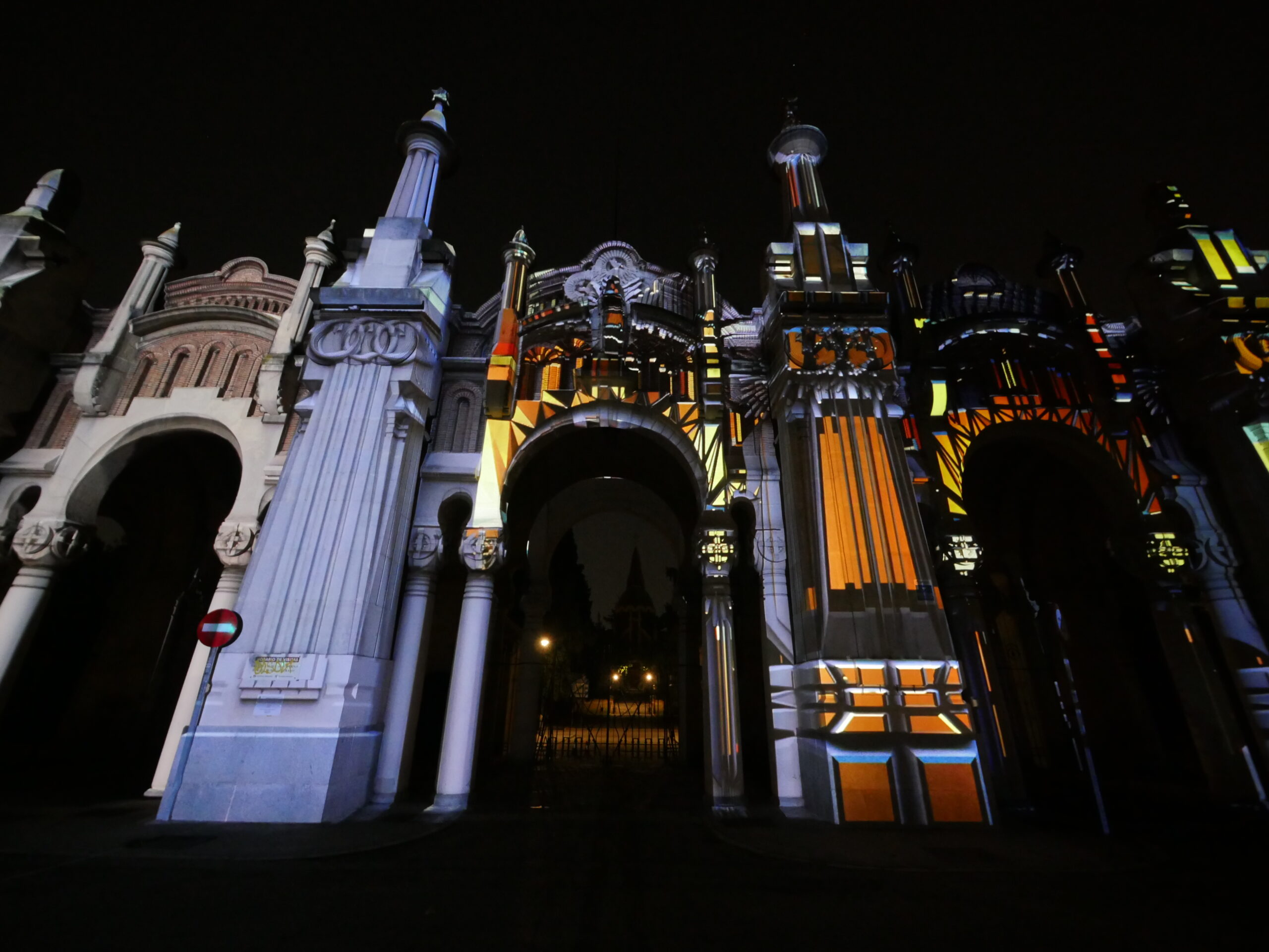 Proyección realizada sobre la fachada de la entrada principal al Cementerio de la Almudena en Madrid, en una noche de luna llena.