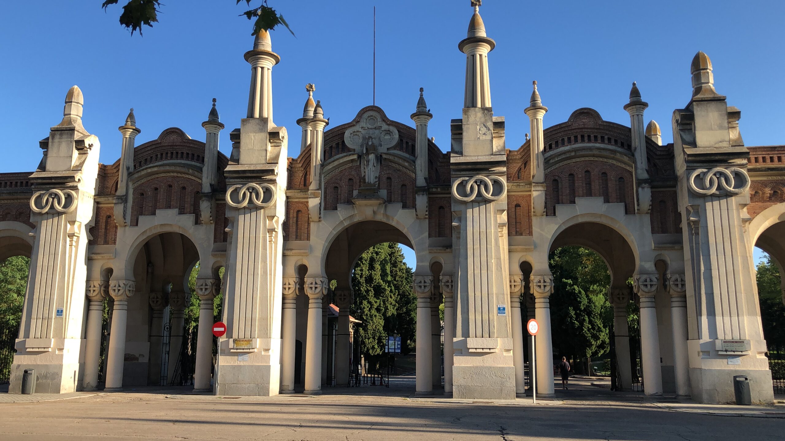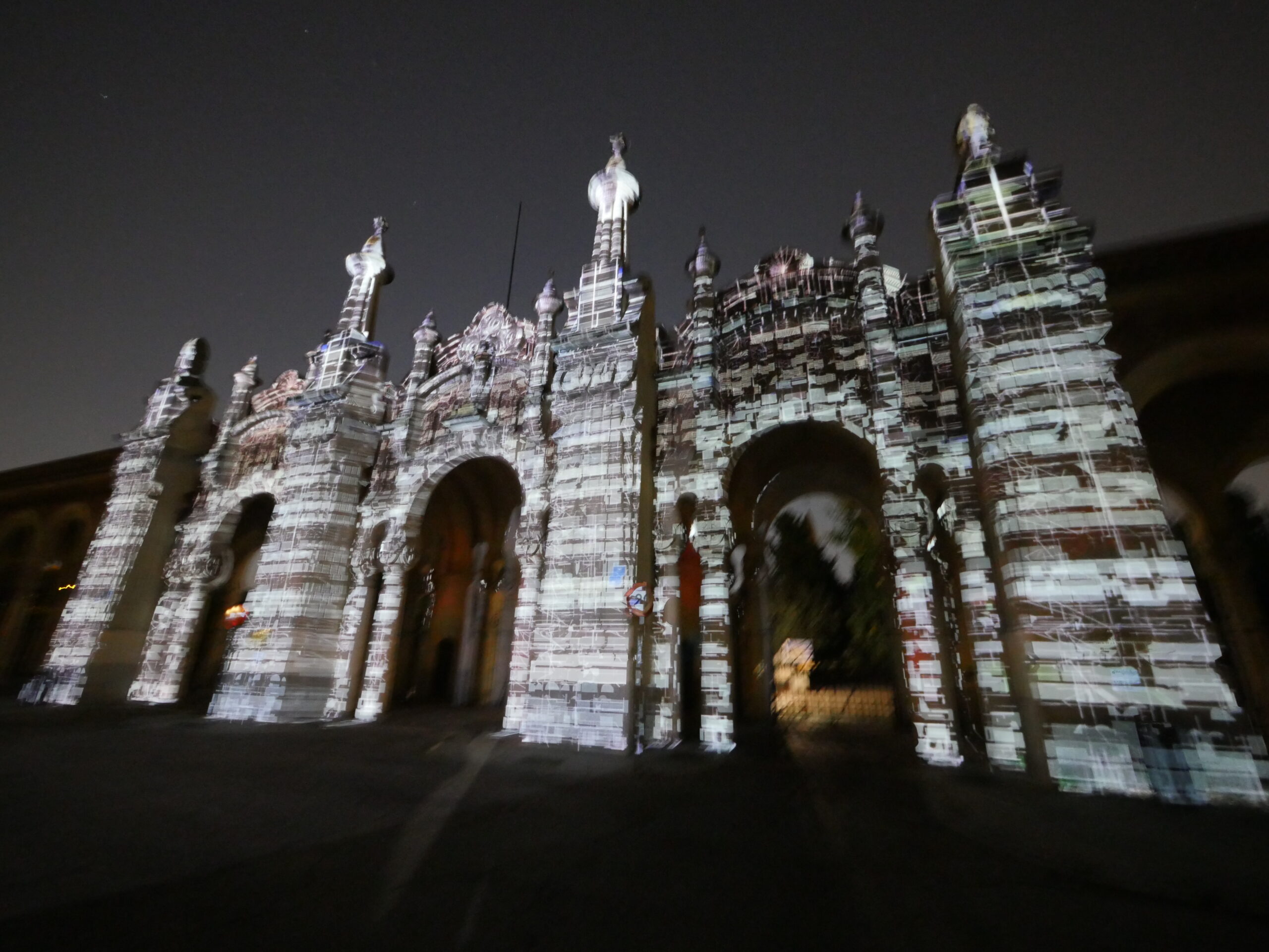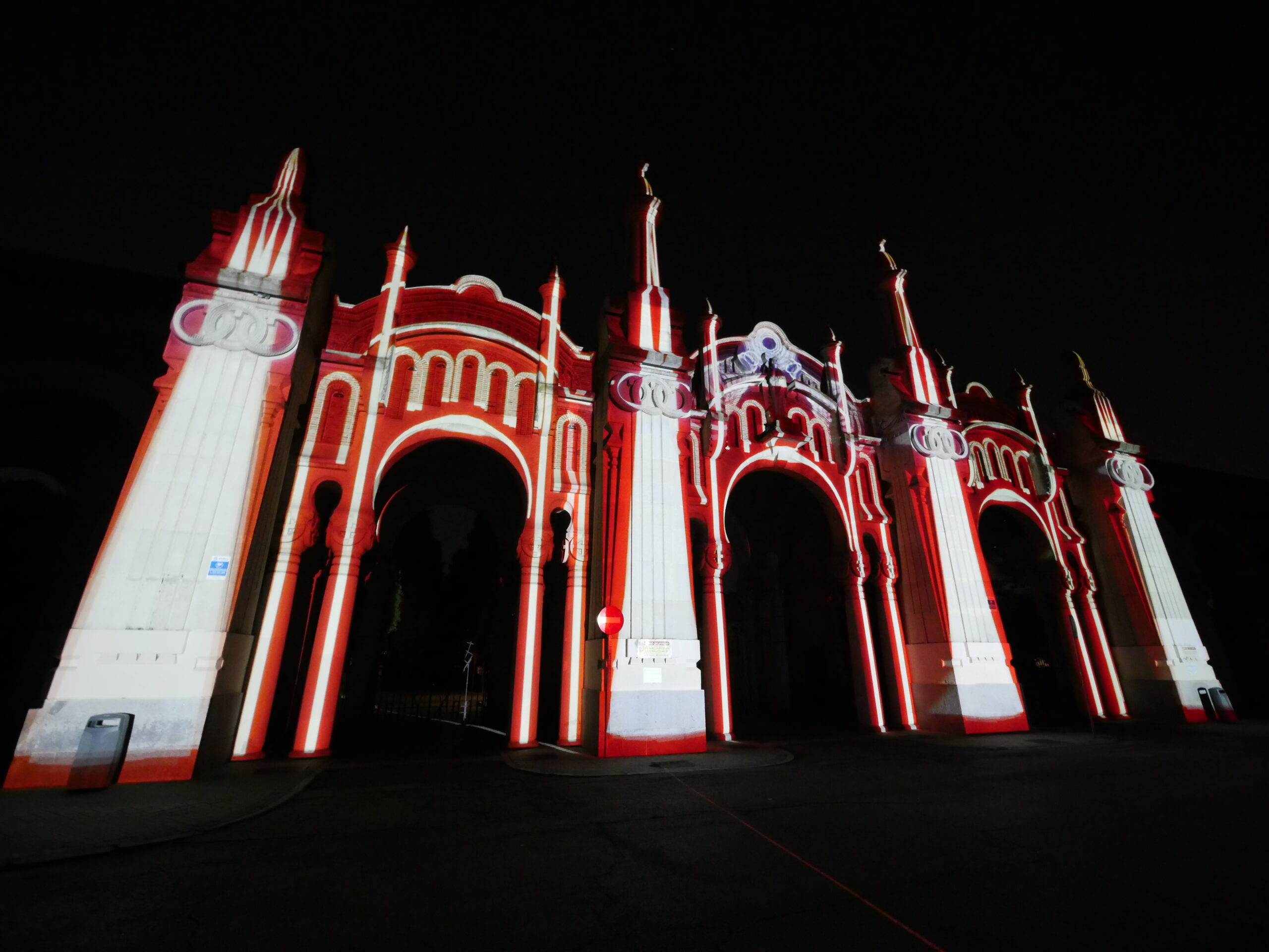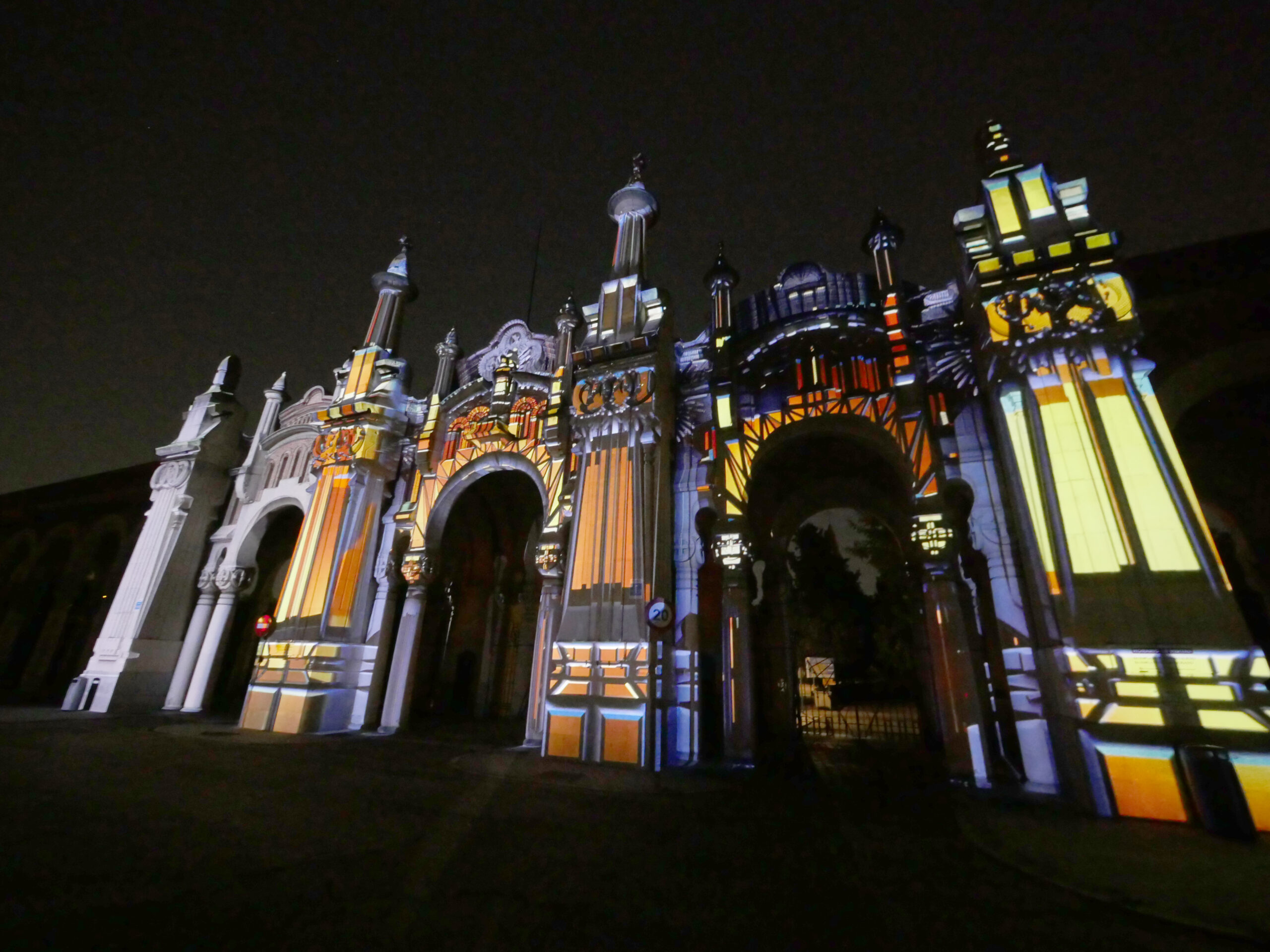 Proyección realizada sobre la fachada de la entrada principal al Cementerio de la Almudena en Madrid, en una noche de luna llena.
